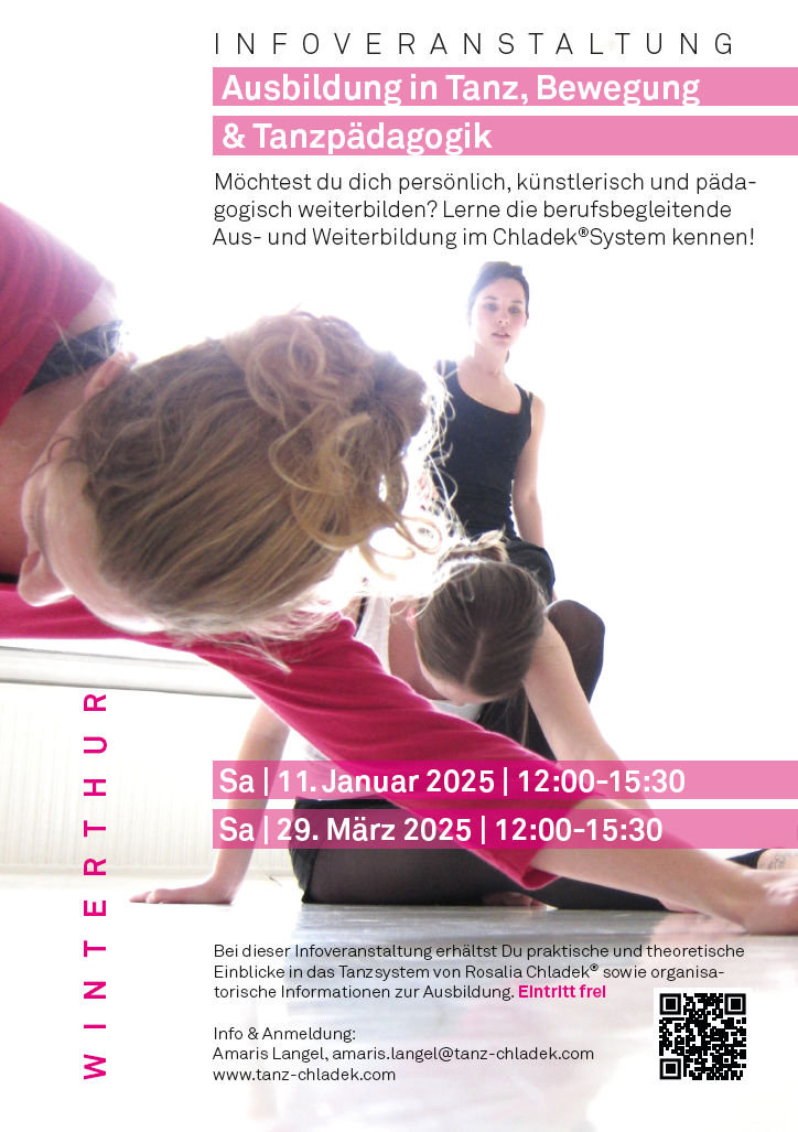 Möchtest du dich persönlich, künstlerisch und pädagogisch weiterbilden? Lerne die berufsbegleitende Aus- und Weiterbildung im Chladek®System kennen. An dieser Infoveranstaltung erhältst du praktische und theoretische Einblicke in das Tanzsystem von Rosalia Chladek® sowie organisatorische Informationen zur Ausbildung. Eintritt frei.